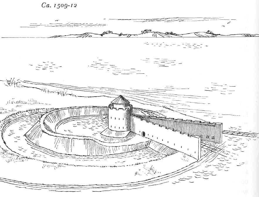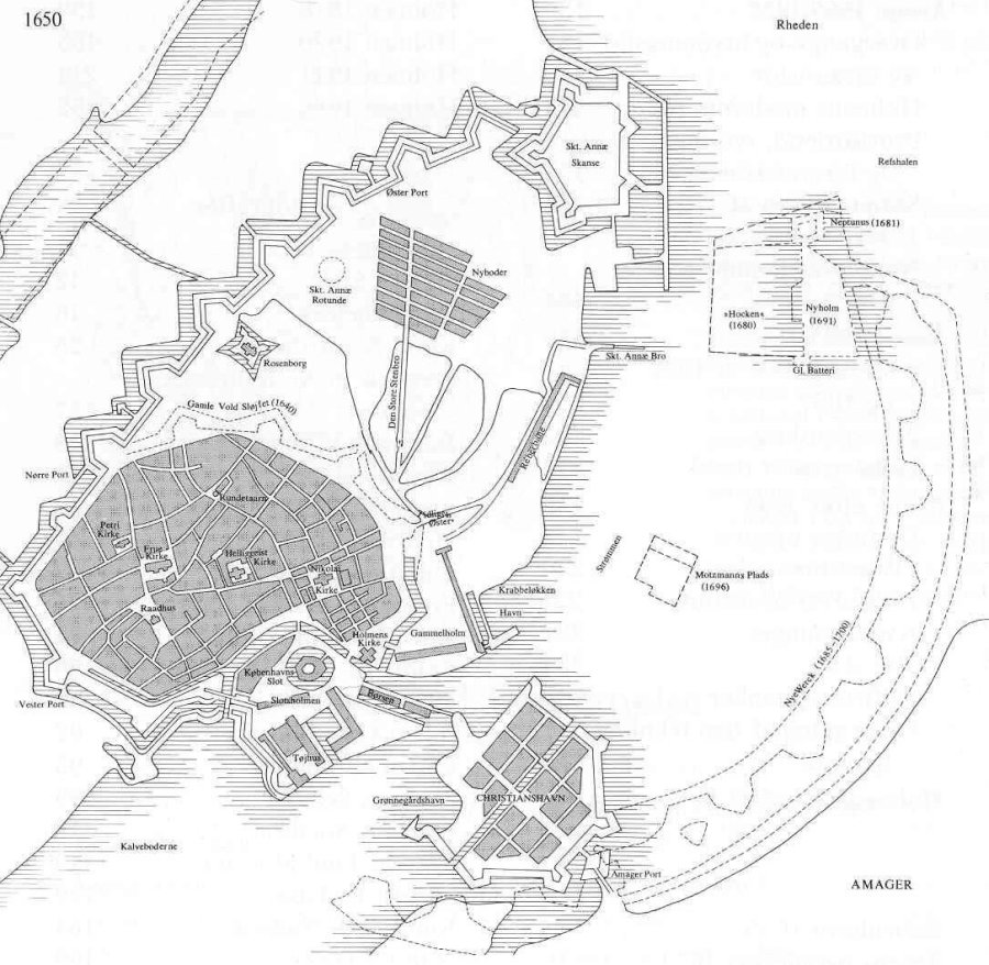 | Allerede i 1400 tallet var der flådeværft på Slotsholmen. Desuden anlagdes tidligt værfter for krigsskibe ved Sønderborg og i Kalundborg. Omkring 1510 byggede kong Hans værftet Engelsborg på den lille ø Slotø i Nakskov fjord. Værftet er blevet udgravet omkring 1950. Engelsborg havde to "bradebænke" eller stabler, dvs. at der samtidig kunne bygges to skibe. Træet var egestammer, der blev fragtet over fra Lolland. Omkring 1550 oprettede Chr. 3 et nyt værft på Bremerholm (senere kaldet Gammelholm), der blev udbygget under Fr. 2. Det blev først endeligt nedlagt midt i 1800-tallet. Chr. 4 byggede flådehavnen Tøjhushavnen, men bygningen af Knippelsbro 1618-20 vanskeliggjorde besejlingen af havnen nordfra. Større skibe måtte nu lægges i Krabbeløkke Havn n. f. Christianshavn og materiel fra tøjhuset til orlogsskibene måtte fragtes på pramme. I 1679 var flåden vokset til 56 skibe og de tæt oplagte skibe var meget udsat for brandfare. I 1681 blev det bestemt, at der skulle anlægges et nyt flådeleje ud for Skt. Annæ Bro (hvor Kastellet senere blev bygget). Flådelejet blev anlagt som en pælespærring, kaldet "Hocken". Pæleanlæggets østlige og sydlige spærring mødtes ved Gamle batteri og et nyt batteri, Neptunus, anlagdes ved det nordøstlige hjørne. Indsejlingen til havnen skete nu gennem det kun 20m brede Bomløb. I perioden 1685-1700 anlagdes Nye Werck (Christianshavns Vold) med bastionerne (nævnt i rækkefølge fra sydvest) Ulrik, Sofie Hedevig, Wilhelm, Carl, Frederik, Charlotte Amalie og Chr. Quintus (senere blot Quintus), opkaldt efter Chr. 5´s børn og ham selv. Wilhelms og Carls Bastion blev forsynet med krudthuse i 1688 hhv. 1690. Krudthuset i Wilhelms Bastion er voldområdets ældste bevarede bygning. |