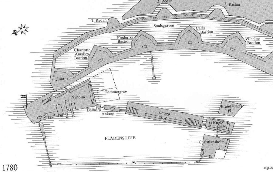 Den er nedrevet. I 1740´erne opfyldtes en del af området imellem Arsenaløen og Nyholm, hvorved øerne Langøen (den vestlige del af den senere Frederiksholm), Ankerøen og Ballastøen, der tilsammen danner en kæde mellem Christiansholm og Nyholm. På Langøen opførtes et Mærseskur og Masteskure. |