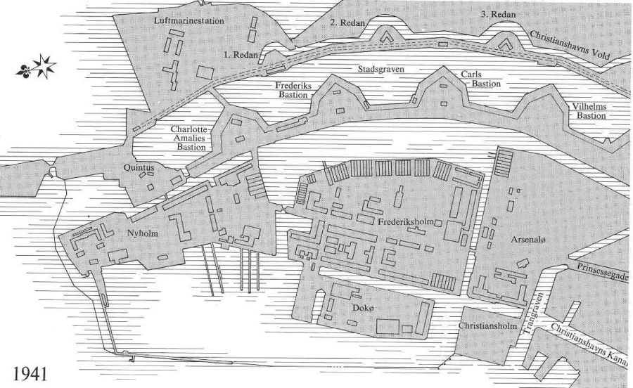 og Belgien. En ny Søofficerskole påførtes 1938-30 på Nyholm. Derved kunne uddannelsen af søofficerer, der havde forgået i en række bygninger, få fast opholdssted. 1939 opførtes et flyvemaskineværksted på det sydlige Frederiksholm. Her skulle luftfartøjer til hæren og flåden bygges. Virksomheden blev indstillet efter besættelsen og værkstedet anvendtes i stedet til eftersyn af motorer fra Torpedobåde. Desuden udvidedes luftmarinestationen på Margretheholm. I 1941-42 byggedes et elektronikværksted på Frederiksholm. Det anvendes nu som værksted for Arkitektskolen.