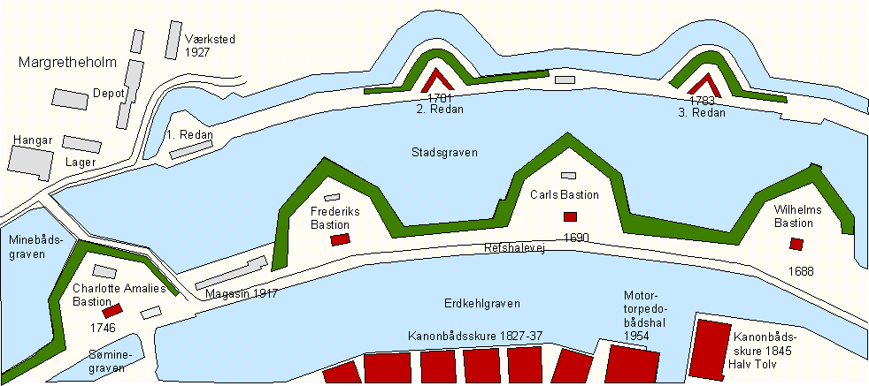 påtrængende. De 15 minestrygere, der var til rådighed var slet ikke tilstrækkelige og der blev lånt 10 fartøjer fra England og suppleret med yderligere 20 tidligere tyske fartøjer. I alt blev ca. 20.000 miner uskadeliggjort. I efterkrigstiden finansieredes en del nybyggeri af skibe ved amerikanske tilskud, f.eks. med 50% amerikansk og 50% dansk finansiering. Orlogsværftet lukkedes for nybygninger i 1970 efter politisk beslutning og beskæftigede sig derefter kun med reparations- og vedligeholdelsesopgaver. Værftet blev nedrevet 2001-02 i forbindelse med opførelsen af den nye Opera. Byggearbejder De af Holmens bygninger, der havde været anvendt af tyskerne var i meget dårlig stand, f.eks. havde officersskolen været anvendt til lazaret. Den istandsattes og kunne tages i brug allerede i januar 1946. På Frederiksholm blev kulissemagasinet til det Kgl. Teater nedrevet og i stedet byggedes barakker til undervisning af mather. De fik kun en levetid på knap 10 år fordi de lå i vejen for opførelsen den store byggehal, der senere blev kendt som Motortorpedobådshallen. Det betød også et farvel til den gamle Dehlehave (skure til opbevaring af træ). Den ny hal var en stor, lukket byggehal med et overdækket udrustningsbassin ud til Erdkehlgraven. Der var plads til seks torpedobåde. Motortorpedobådshallen er senere ombygget til eksklusive ejerlejligheder (færdige 2002). 1956 genopbyggedes Søværnets Minesektion på Quintus Bastion, der havde ligget i ruiner efter en eksplosion i 1951. |