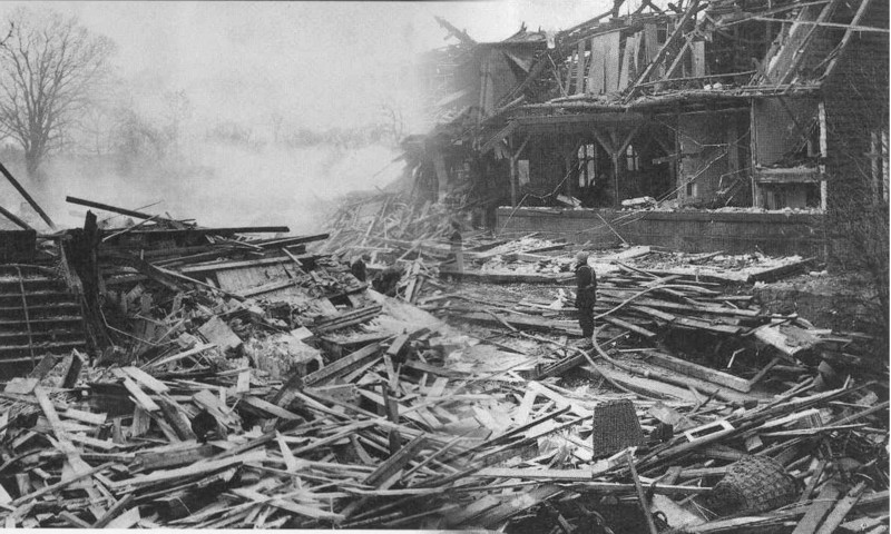Mineværksteder efter eksplosionen 24. november 1951. Minerne blev opbevaret i et rum med trævægge opvarmet med en kakkelovn. |