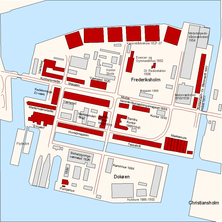 fra eksplosionen kunne høres i Malmø! På ulykkesstedet opførtes en treetages Teknikerskole og kontorbygning i en noget kølig funktionalistisk stil. Bygningen var kendt under navnet "Hotel Lille Europa". På nordsiden af Frederiksholm nedrevedes de gamle kanononbådsskure og erstattedes af et værksted for u-bådsakkumulatorer. Det er nu overtaget af Rytmisk Musikkonservatorium. På Arsenaløen opførtes en treetages kontor- og artilleriværkstedsbygning, der var færdig 1961. Holmen efter 1989 I 1989 nedlagdes store dele af holmen som flådeområde og kun Nyholm den vestlige del af Arsenaløen anvendes fortsat af marinen (Marinestation København). Efter flådens rømning er der opført boliger på Arsenaløen og Frederiksholm og mange bygninger er overgået til civile undervisningsformål: Arsenaløen: Frederiksholm: |