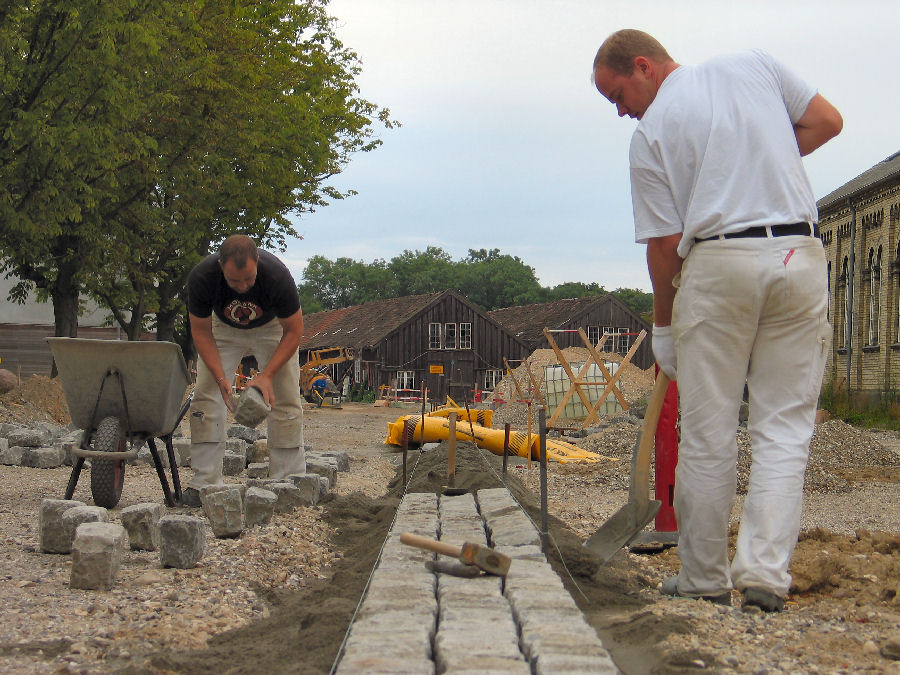 arbejdes med at lægge brostenskanter for den